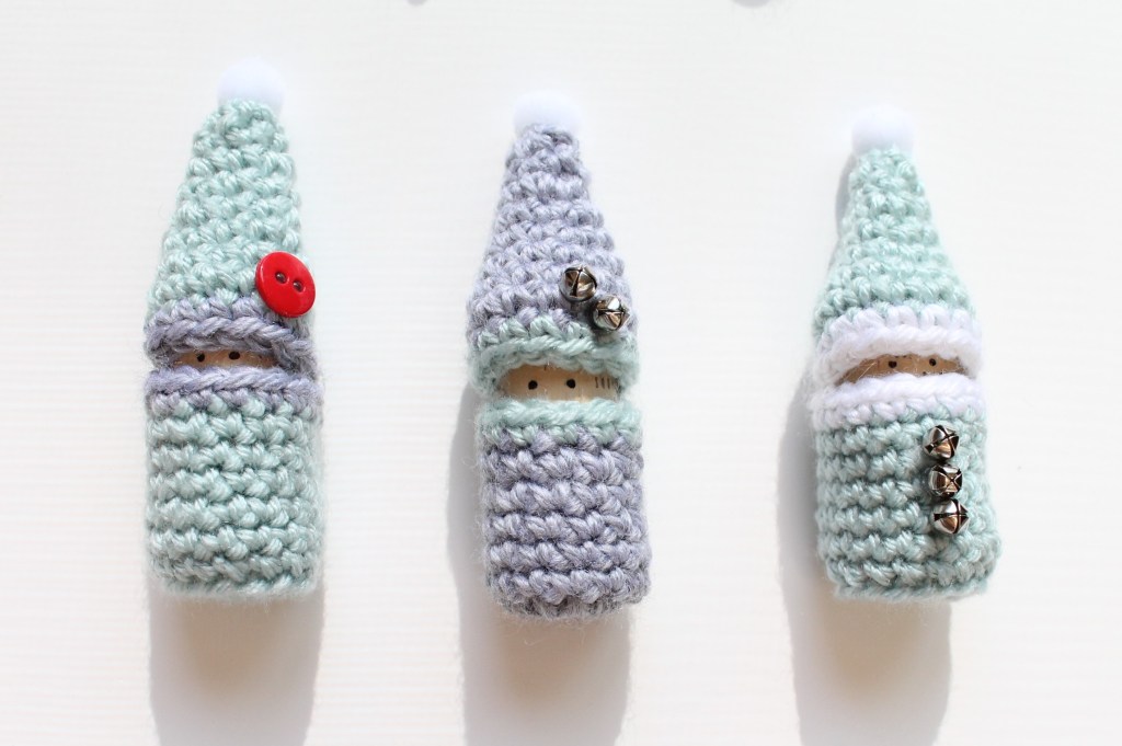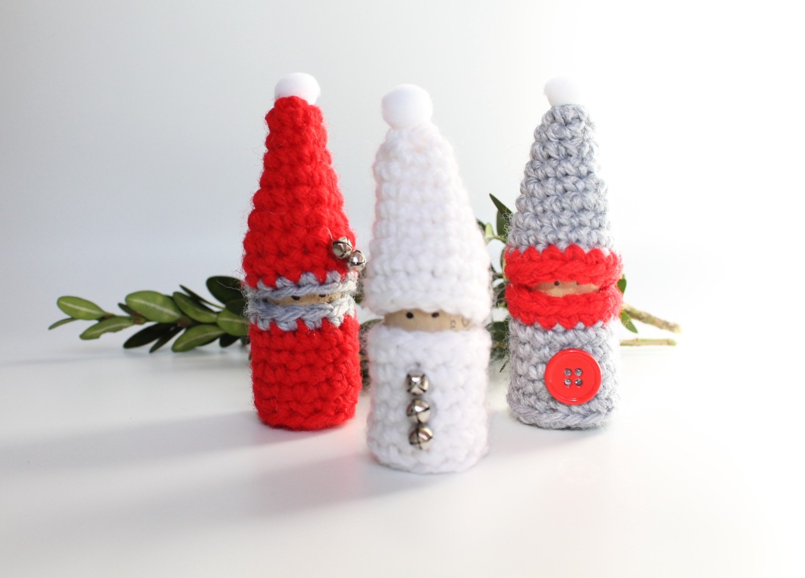 Enter Mini Cork Elves. At just 4″, they use a wine cork for the body, about 5 yards of yarn for the sweater and trim, and about 8 yards for the hat and trim. They look adorable in winter colors like grey and white, Christmas colors of red and green, or any fun combinations of your choosing. For example, I depleted a small stash of mint yarn I had on hand, and combined it with grey and white to look modern and wintery. See some of my color ideas here.