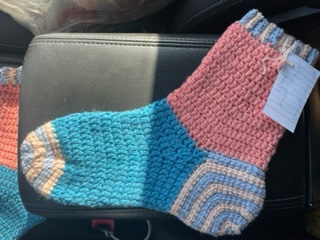 Once I felt good about using only two colors, which has the benefit of a more straight forward and user-friendly pattern, I reinforced the fractal look with a third hit of the two colors in the cuff. The striped cuff also lends to the fun secrecy of the socks. Here is the pic I took in the post office parking lot before I shipped them off to the UK.