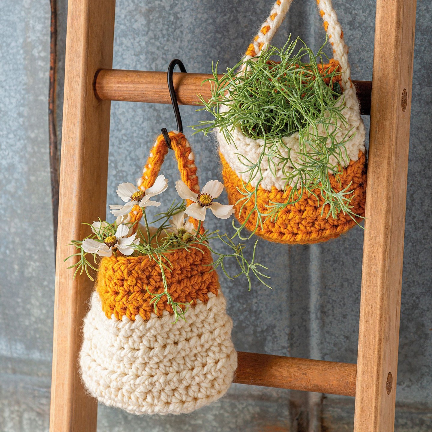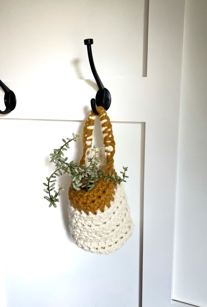 With its prominent texture and use of earthy colors, this hanging basket gives modern boho vibes. The neutral off-white yarn paired with the warm mustard lend to the creative and carefree bohemian aesthetic. The wrapped embellishment around the strap creates an eclectic feel and the chunky, cozy yarn brings it to life.