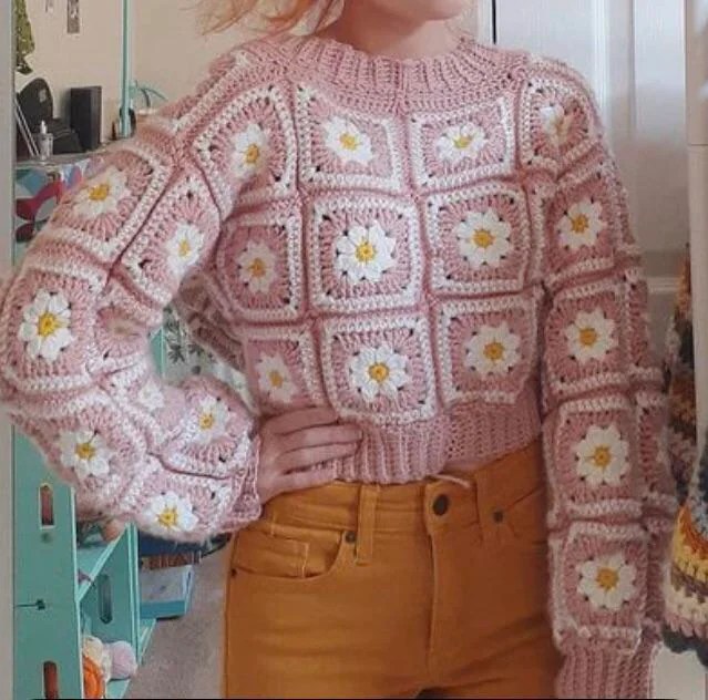 I’d love to make something different this year, though, and the pumpkin garland has me thinking about pumpkin granny squares! I did a quick search and found several different styles online. I found a few appealing videos, and Yarnspirations has this fun pumpkin patch granny square blanket (I’d use an off-white instead of the green, personally). But how cute are the squares?! I’d love to use them on the sleeve of a sweater like this sweater I designed, as the final row at the base of an otherwise super simple sweater, or sewn together to comprise the whole sweater, like the image below. That would be so cute!