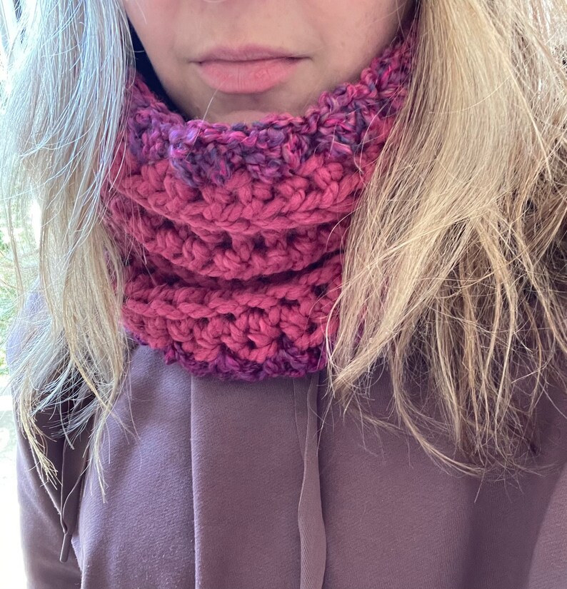 4. Chunky Cowl Scarf: This scarf is so comfortable to wear. It gives that full look and keeps you warm without being bulky. It’s quick to make and the textured trim gives a pop of color and softness.
