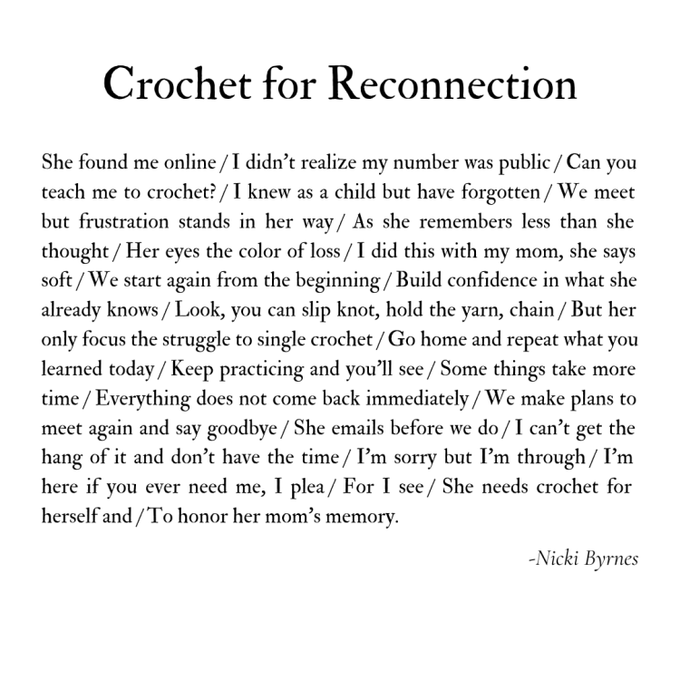 Note: A few years ago, I got a glimpse of what life would look like without my mom. I didn’t like it. In 2008, I saw my cousins lose their mom and navigate insurmountable grief. I didn’t like it. And a few years ago, what started out as a casual crochet lesson turned into a reminder that grief does not go away for so many who have lost their mom. It rears its ugly head at unexpected times. Here’s a poem about what I call “The 4 P’s of Crochet” (like the 4 P’s of Marketing), with her story, and that of so many, woven in. I’m sharing today, Mother’s Day, for anyone struggling with grief and loss.