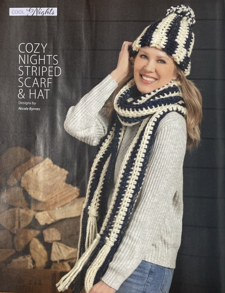 The Cozy Nights Striped Scarf and Hat are perfect for a classic Fall night, sitting by a bonfire in chilly temperatures, wrapped up in something cozy, looking up at the stars in the dark night sky.